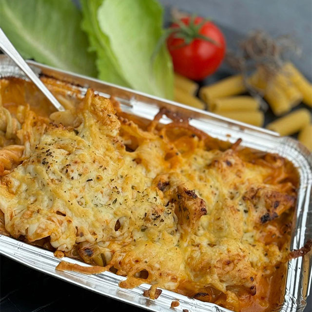 Frisch zubereitete bunte Spiralnudeln in Rahmsauce mit Hähnchenbrustfilet, Käse überbacken und Oregano.