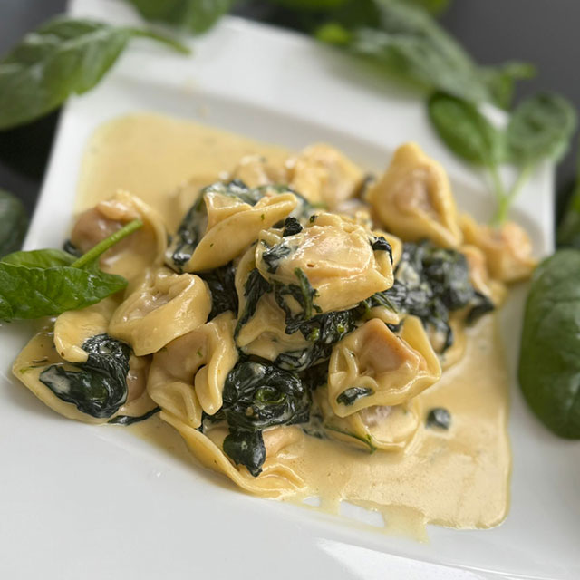 Frisch zubereitete Tortellini mit Fleischfüllung, Blattspinat, Zwiebeln, frischem Knoblauch in Sahnesauce