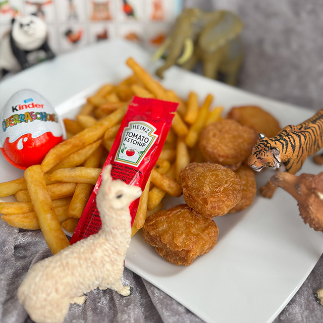 6 goldgelbe Nuggets mit Pommes frites, Ketchup und 1 Kids Getränk, sowie einer kleinen Überraschung
