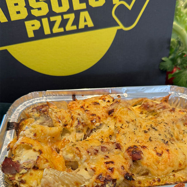 Frisch zubereitete bunte Spiralnudeln in Rahmsauce mit Hähnchenbrustfilet, Käse überbacken und Oregano.
