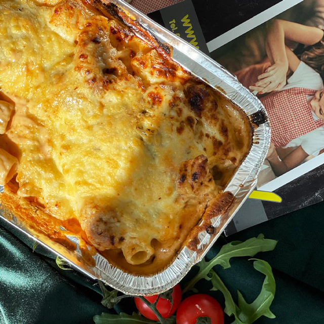 Frisch zubereitete bunte Spiralnudeln mit Bolognesesauce, herzhaftem Schinken, Käse überbacken und Oregano