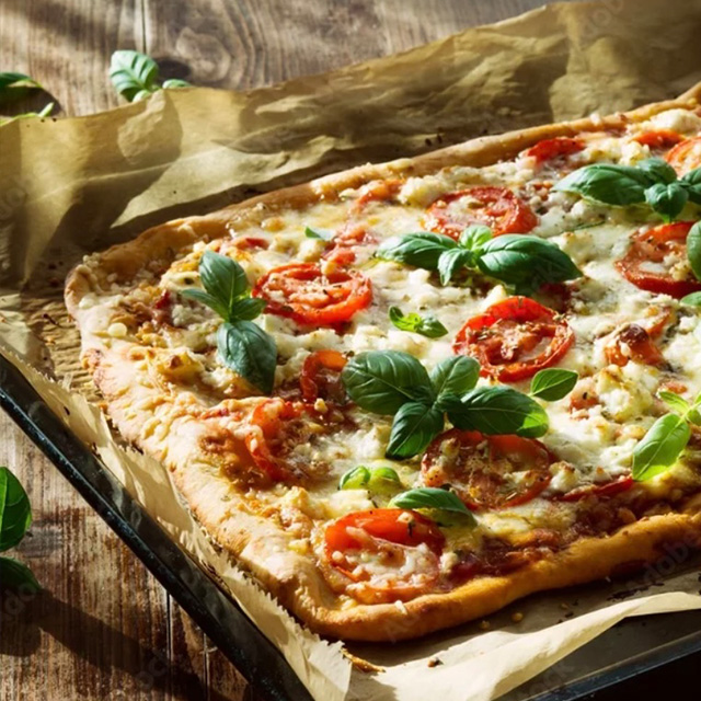 Das Partyblech 45cm x 45cm zum Selbstbelegen. Fruchtige Tomatensauce, herzhafter Käse & Oregano.